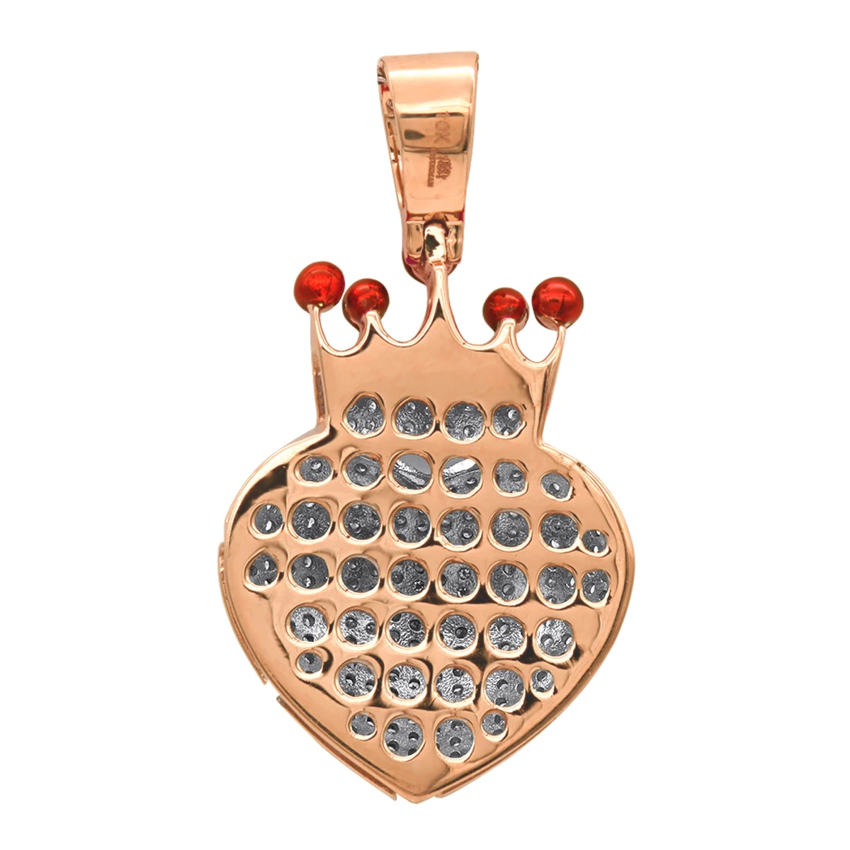 From our Diamond Heart Pendants collection: This very unique Real Diamond Crown Heart Pendant features a 3D shape of a crown heart made in solid 10k gold and fully paved with 1 carat of sparkling round diamonds. Heart is universal symbol of love and it symbolizes the core of romantic love, affectionate emotion and caring; crown is symbol of loyalty and royalty. This elegant diamond heart pendant is a perfect gift for that special someone experiencing great longing. This pendant is quite large at 1.5 inches (37mm) long (including the bail) and 20mm wide, available in 10k yellow gold and white gold. You also can personalize this piece or check we’ve already made and create your own design.