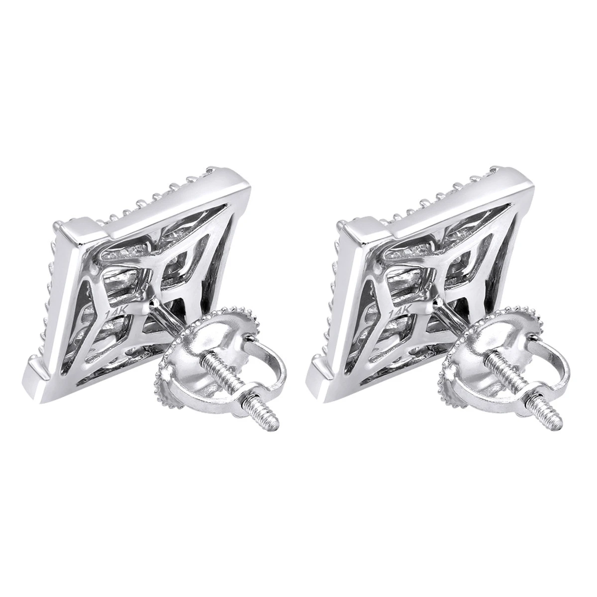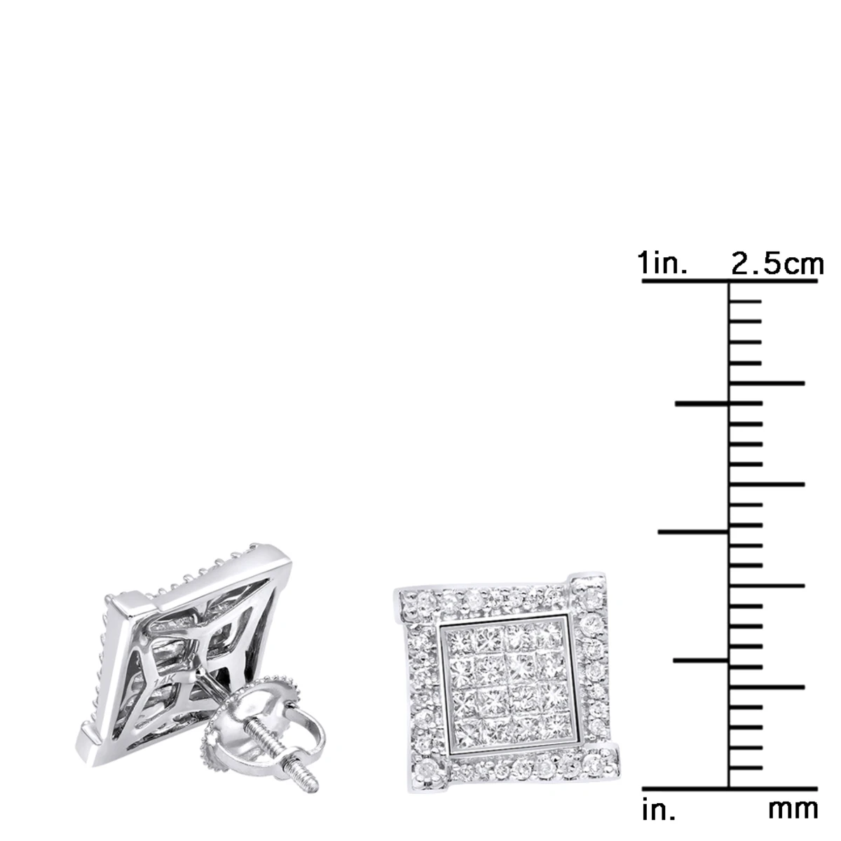 14K White Gold 1 Carat Round & Princess Cut Diamond Earrings Square Studs Men’s Or Women’s