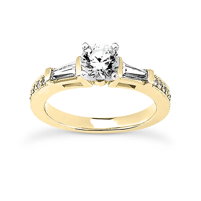 This 14K Gold Diamond Engagement Ring Setting showcases 0.38 carats of dazzling round & baguette diamonds and is available in Platinum, 18k or 14k yellow, rose, white gold, various sizes, and can be customized with any color and quality diamonds. This ring can accommodate from 0.50ct to 5ct round stone as a center (gold weight and number and carat weight of side stones may vary). Please note: This listing is for engagement ring Setting only, center diamond is for illustration purposes only and is sold separately. This Setting is priced to fit up to 0.50ct center stone. If you need it to fit a larger stone please contact us toll free in USA: 1-866-423-6262 or outside USA: 212-398-3123 prior to making a purchase as the price will vary depending on the size of your center stone.