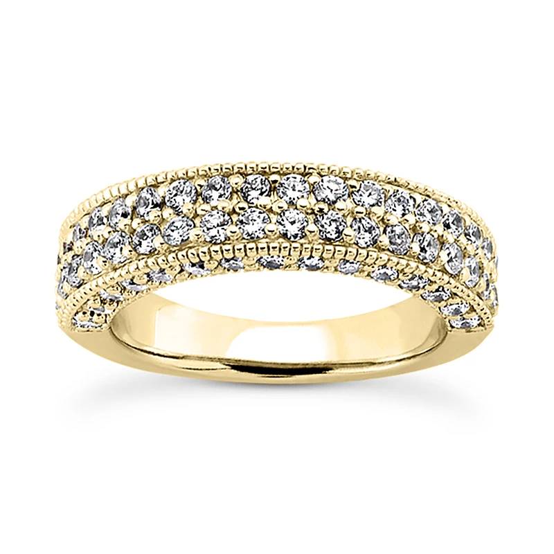 This 14K Gold Diamond Unique Engagement Band showcases 1.05 carats of dazzling round diamonds and is available in Platinum, 18k or 14k yellow, rose, white gold, various sizes, and can be customized with any color and quality diamonds. Please contact us if you would like to customize it.
