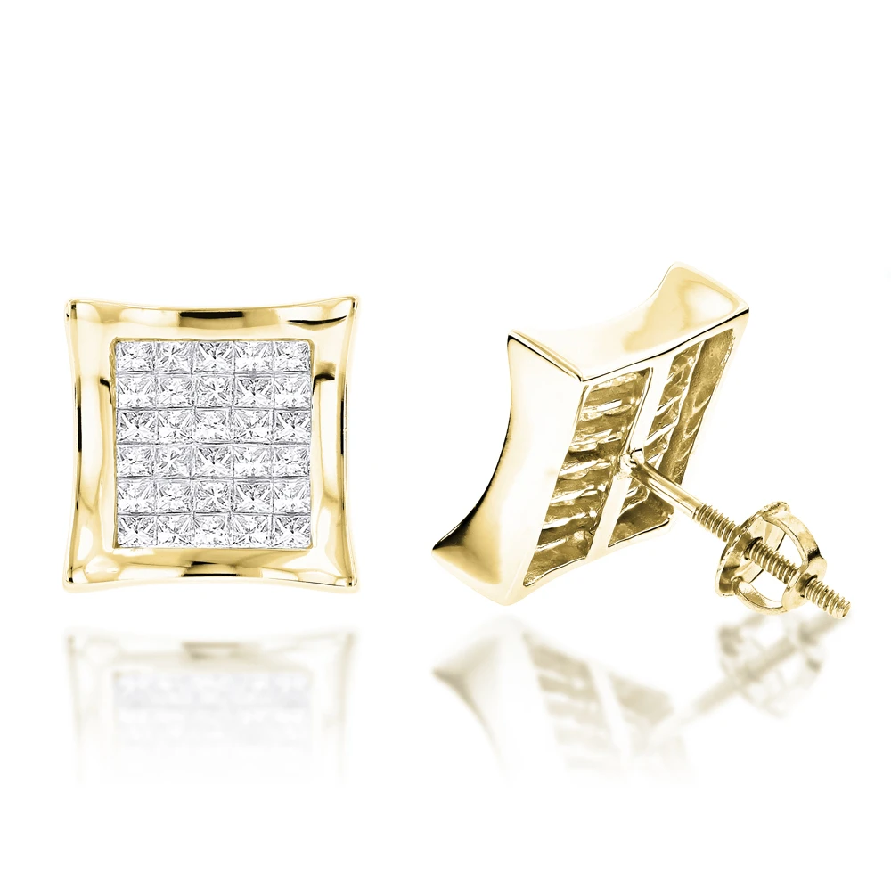 Princess cut diamond stud earrings collection: These 14K Gold Invisible Set Princess Cut Diamond Earrings for Men and Women weigh approximately 5 grams and showcase 1.25 carats of sparkling princess cut diamonds, each expertly set in invisible setting with highly polished gold frames to make it look like a one large princess cut diamond. Featuring a popular square kite shape and screw back closures for secure wear on pierced ears, these real diamond stud earrings are available in 14K white, yellow and rose gold to accommodate your style.