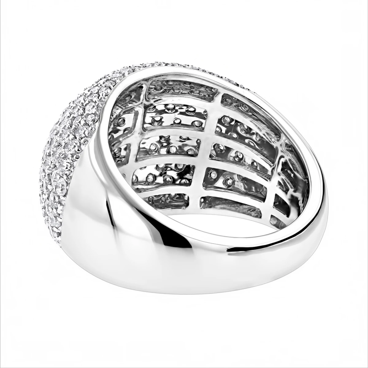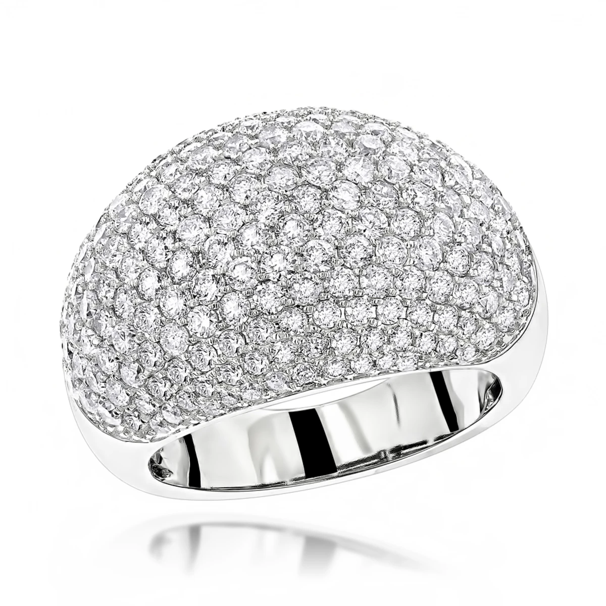 This luxurious 14K Gold Ladies Designer Pave Diamond Ring weights proximately 13 grams and showcases 3.5 carats of dazzling round diamonds each masterfully set in a lustrous gold frame. Featuring a dome shaped design and a highly polished gold finish, this women’s diamond ring from our designer diamond bands collection is available in 14K white, yellow and rose gold.