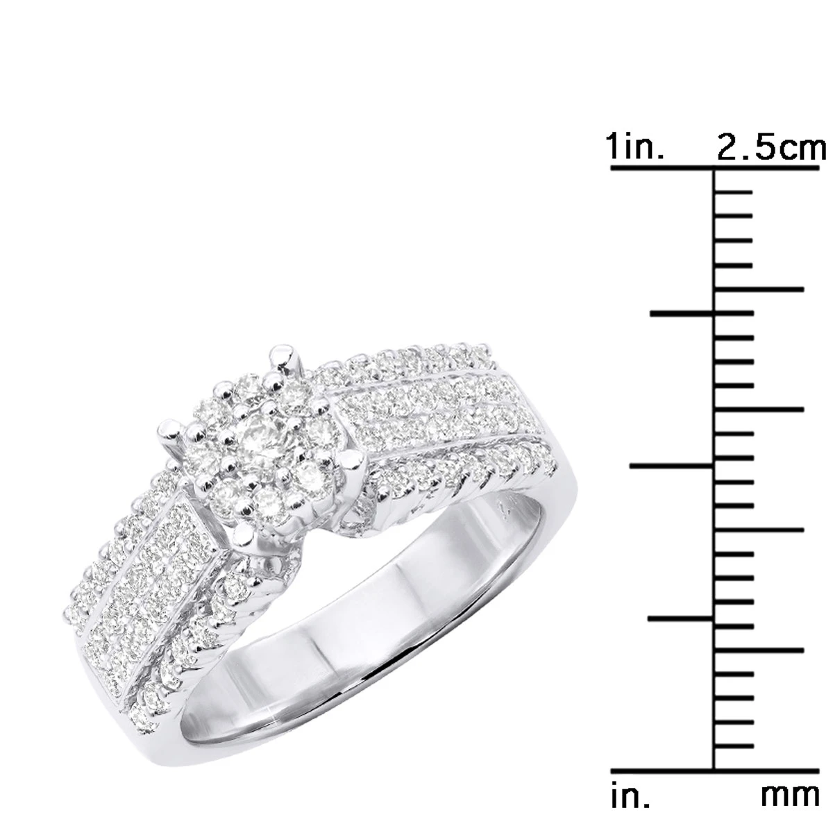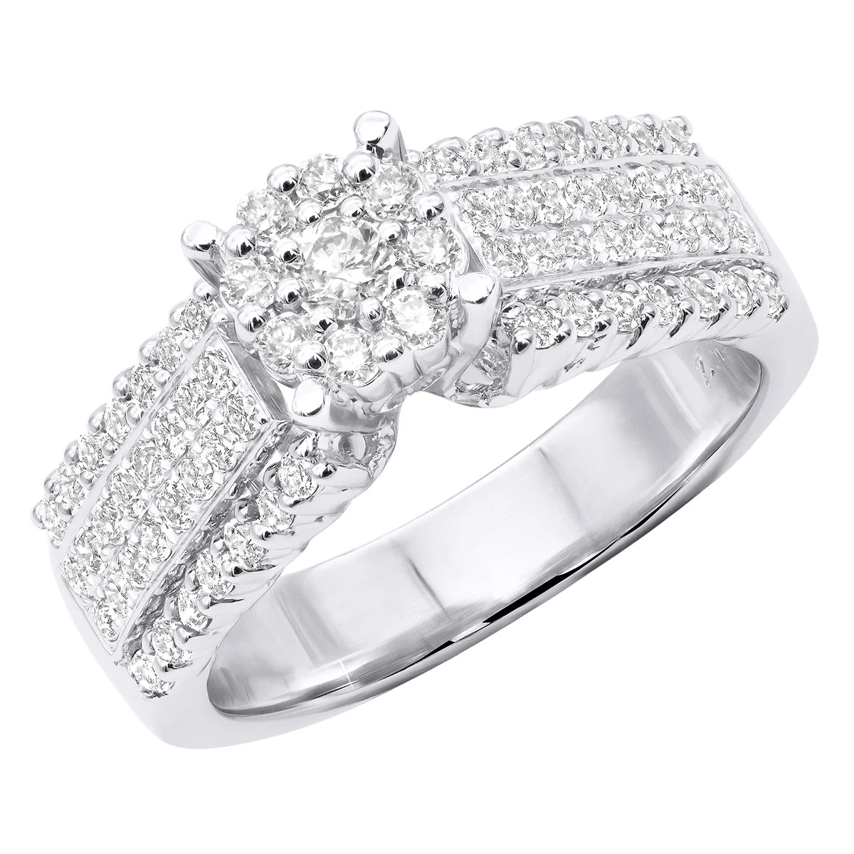 This 14K Pre-Set Diamond Engagement Ring weighs approximately 8 grams and showcases 1.08 carats of sparkling round diamonds. Featuring a lovely cluster design and a highly polished gold finish, this pre-set diamond engagement ring is available in 14K white, yellow and rose gold.