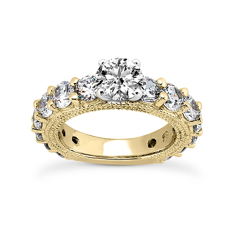 This 14K Gold Unique Diamond Engagement Ring Set consists of an engagement ring mounting and matching band. The mounting showcases 1.76 carats of dazzling round diamonds and can accommodate from 0.50ct to 5ct round stone as a center (gold weight and number and carat weight of side stones may vary). The band showcases 1.91 carats of dazzling round diamonds. Please note: This listing is for engagement ring mounting and matching band only, center diamond is for illustration purposes only and is sold separately. This mounting is priced to fit up to 0.50ct center stone. If you need it to fit a larger stone please contact us toll free in USA: 1-866-423-6262 or outside USA: 212-398-3123 prior to making a purchase as the price will vary depending on the size of your center stone.