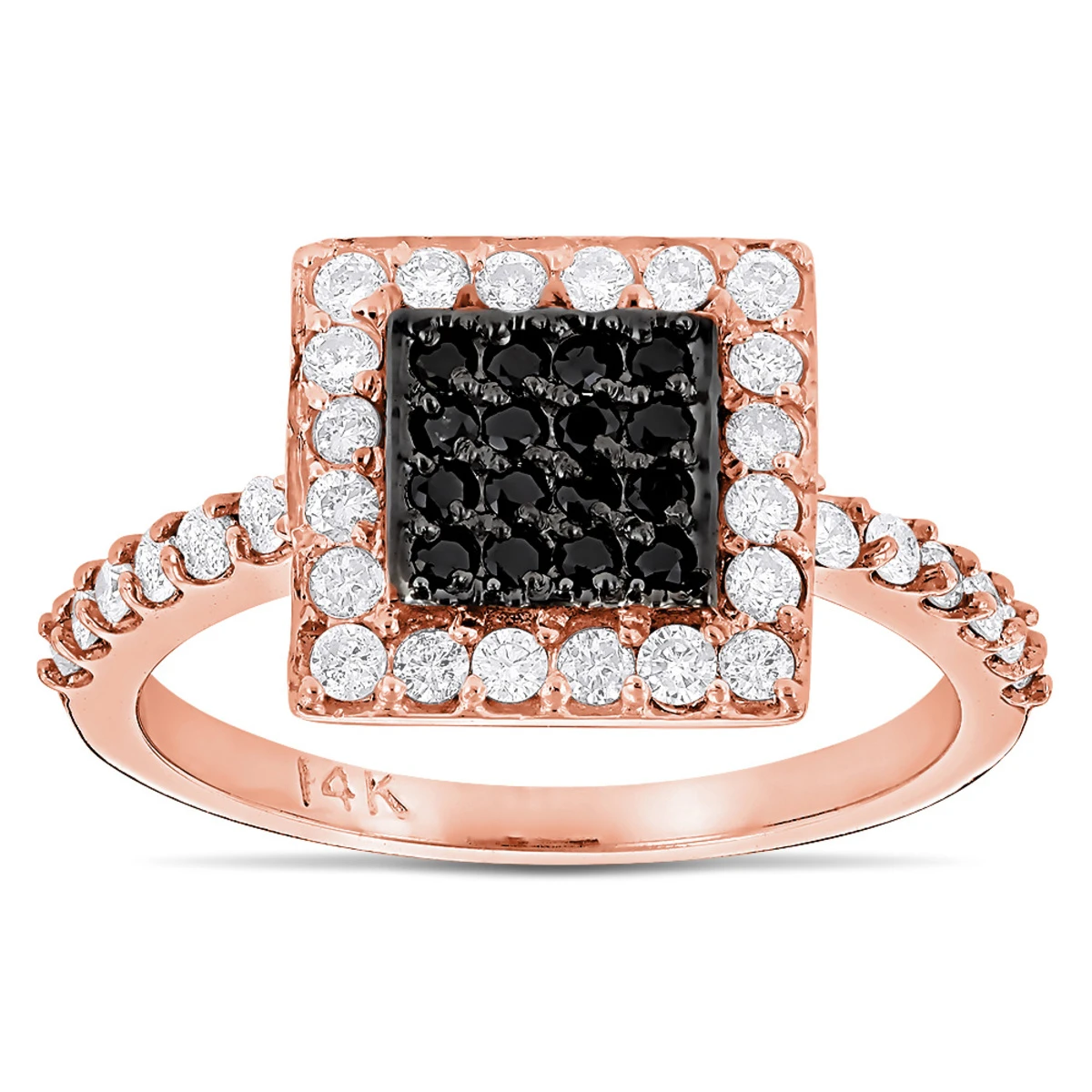 This unique 14K Gold White and Black Diamond Ring For Women showcases 0.62 carats of sparkling round diamonds. Featuring a fabulous design and a highly polished gold finish, this ladies white black diamond ring makes a unique pre-set diamond engagement ring, and is available in 14K white, yellow and rose gold.