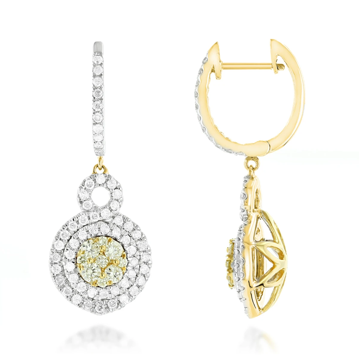 These White Yellow Diamond Cluster Fashion Ladies Drop Earrings by Luxurman featuring 1.45 carats of white and yellow diamonds masterfully prong set on 14K gold base. These ladies diamond earrings with yellow and white diamonds featuring circle design and flower gallery on the back will make great present for any occasion. These diamond drop earrings for women are available in 14K white gold, yellow gold and rose gold.