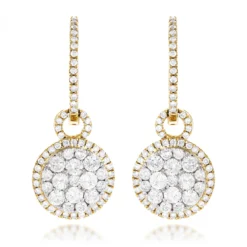 These 14K Gold Designer Diamond Earrings Clusters showcase 2.04 carats of dazzling round diamonds, each masterfully set in lustrous 14K gold. Featuring an intricate circle design and a highly polished gold finish, these magnificent diamond earrings are available in 14K white, yellow,rose gold or a two tone gold finish.