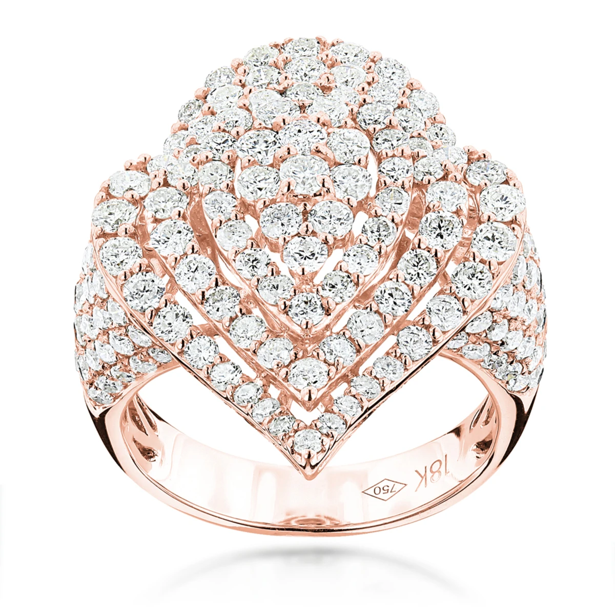 This magnificent 18K Gold Designer Diamond Drop Ring for Women from our designer diamond jewelry collection weighs approximately 8 grams and showcases 3.75 carats of dazzling prong-set round diamonds and pave-set round diamonds. Featuring an intricate drop design and a highly polished gold finish, this beautiful ladies diamond ring is available in 18K white gold, yellow gold, and rose gold.