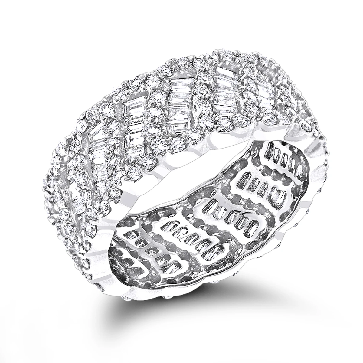 This unique 18K gold designer diamond eternity band features 1.19 carats of round cut diamonds and 1.31 carats of baguette cut diamonds. This dazzling diamond eternity ring is available in 18K white, yellow and rose gold; also available in platinum (please contact us for pricing details)