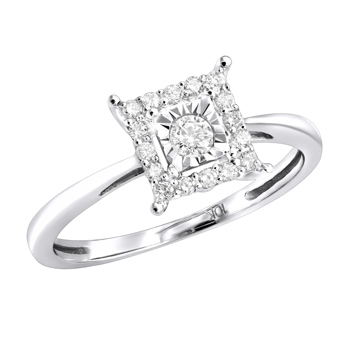 This 10K Gold Affordable Diamond Engagement Ring has a look of a ring with 1 carat center diamond due to its unique diamond setting and showcases 0.27 carats of sparkling round diamonds, and is available in 10K white, yellow and rose gold. This lovely diamond ring makes an affordable pre-set diamond engagement ring or promise ring.