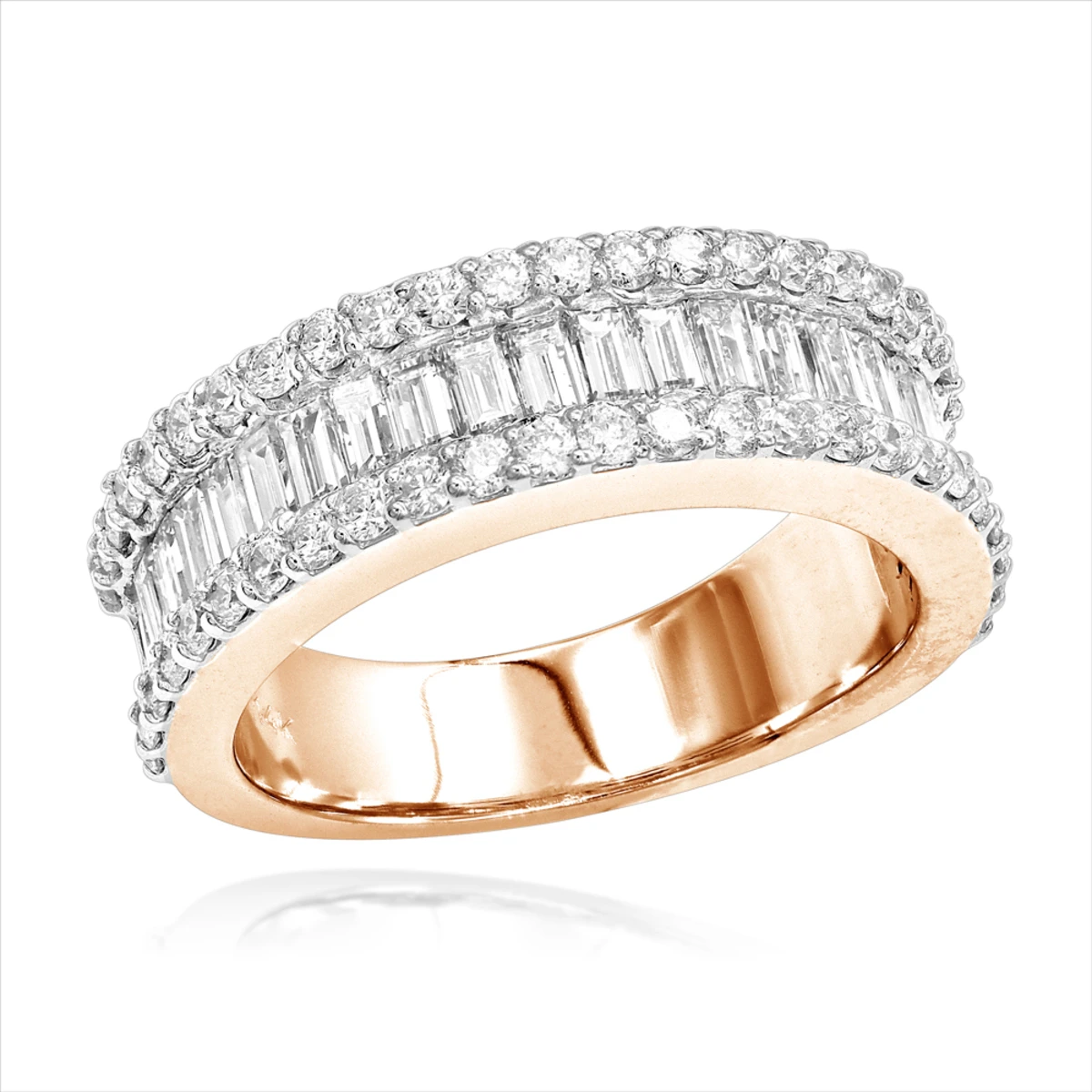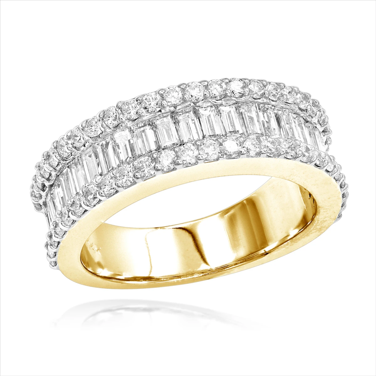 Unique Diamond Bands! This 14K Gold Round Baguette Diamond Band showcases 1.84 ctw of glistening channel-set baguette diamonds and prong-set round diamonds. Featuring an elegant design and a highly polished gold finish, this women’s diamond band is available in 14K white, yellow and rose gold.