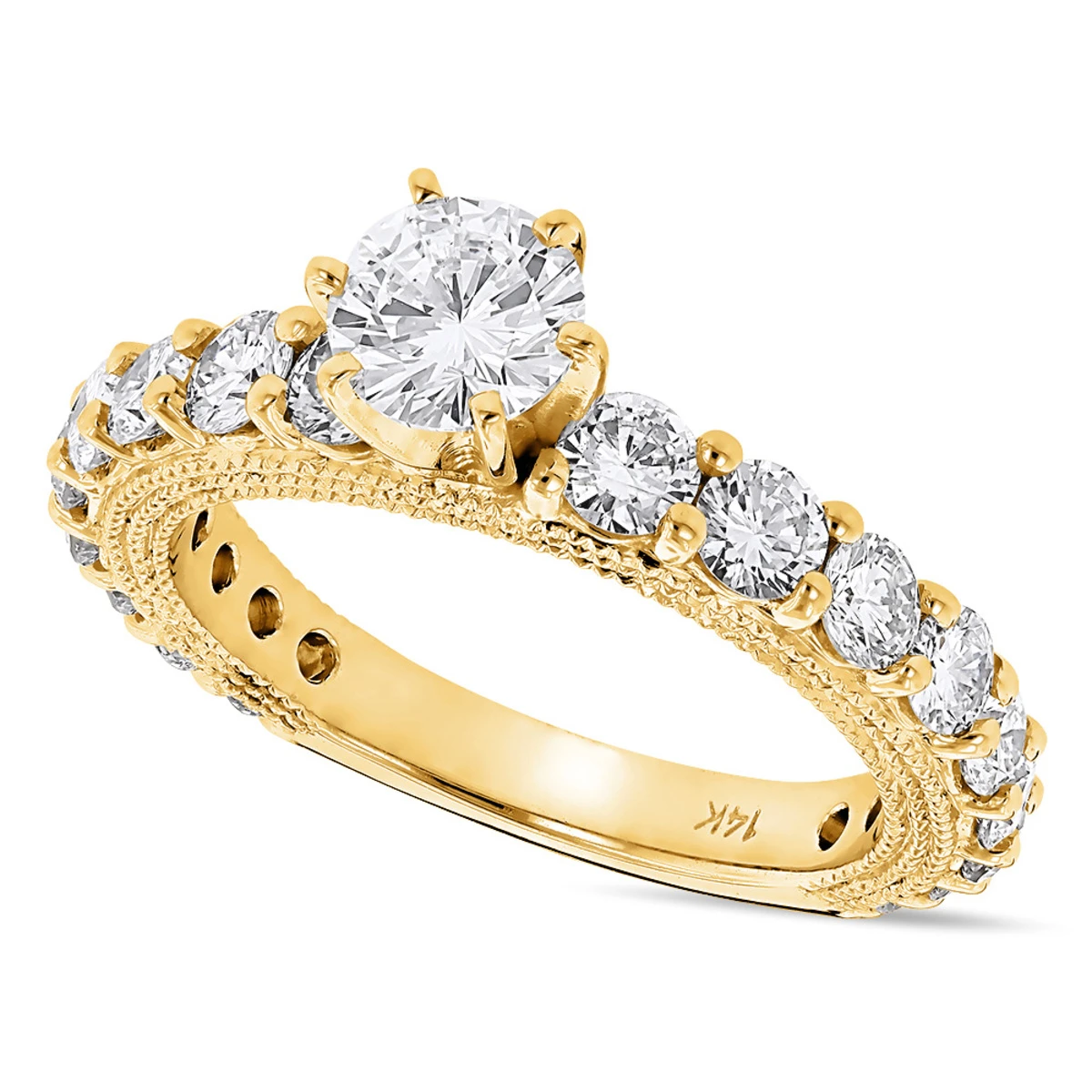 This G/VS Round Diamond Engagement Ring is available in 14k and 18k yellow, rose or white gold as well as platinum and showcases a 3/4 carat round diamond in the center and 1 3/4 carats of round diamonds on the sides for a total of 2.5 carats of dazzling diamonds. This classy diamond engagement ring also comes in various sizes, and can be customized with any color and quality diamonds. Center diamond can be from 3/4ct to 5ct (3/4 center diamond is included in the price). Please note: it will take us 3-5 business days to make this ring for you so please plan accordingly. Please contact us at 212-398-3123 if your size or desired option is not listed.