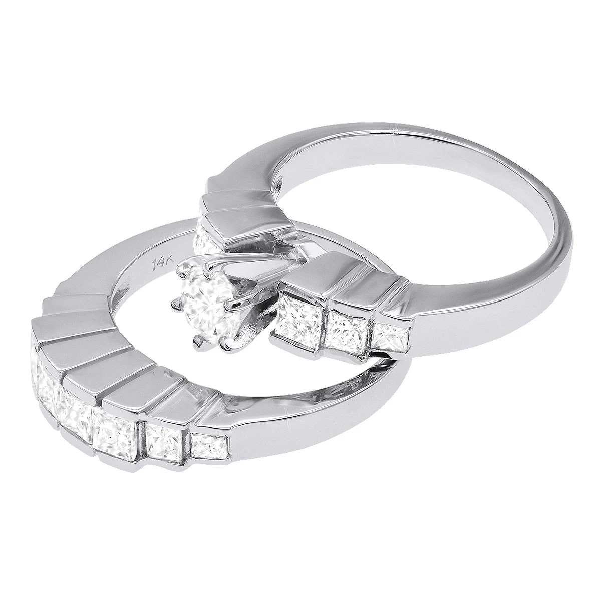 This 14K Gold Diamond Designer Engagement Ring set consists of a diamond engagement ring and matching diamond band. The ring weighs approximately 6.2 grams and showcases a 0.50 carat round diamond in the center and 0.64 carats of princess cut diamonds on the sides for a total of 1.14 carats of dazzling diamonds. The Engagement band weighs approximately 5.5 grams and showcases 0.86 carats of dazzling princess cut diamonds. This set is available in Platinum, 18k or 14k yellow, rose, white gold, various sizes, and can be customized with any color and quality diamonds. Please contact us if you would like to customize it.
