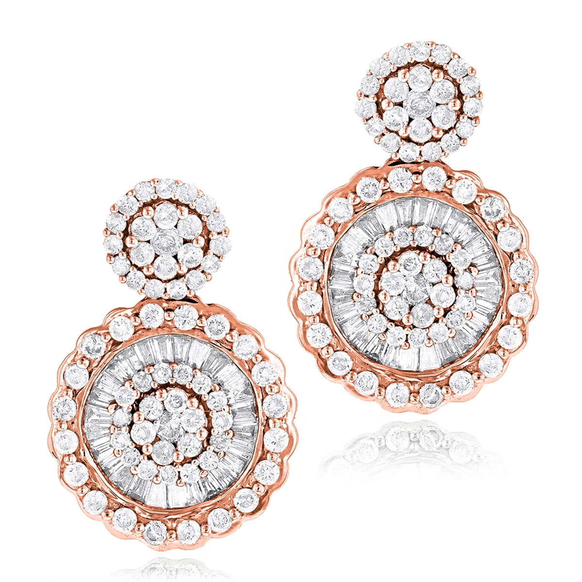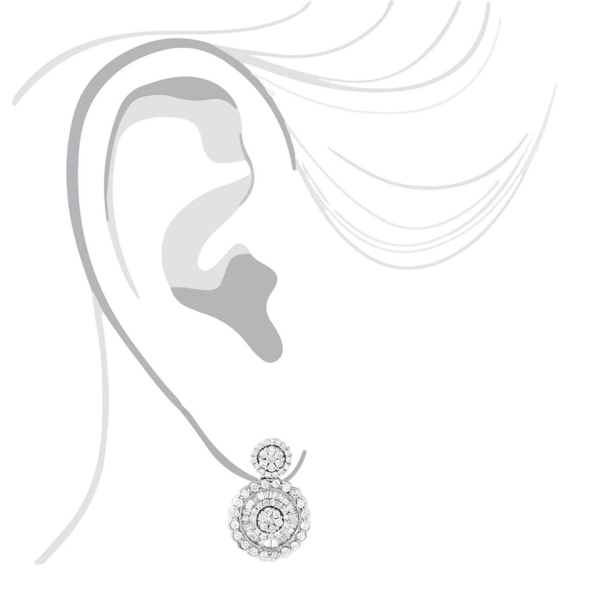 These Ladies 18K Gold Designer Diamond Earrings showcase 1.78 ctw of dazzling round and baguette diamonds, each masterfully set in lustrous 18K gold. Featuring an intricate circle design and a highly polished gold finish, these magnificent diamond earrings are available in 18K white, yellow and rose gold.