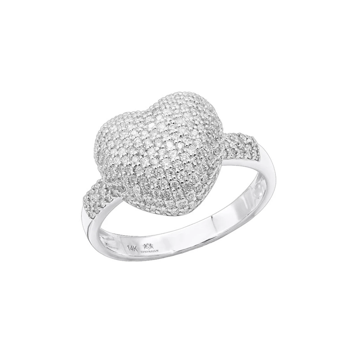 This Lovely Ladies Pave Diamond Heart Ring showcases 1 carat of sparkling round diamonds. Featuring a fabulous puffed heart design and a highly polished gold finish, this women’s diamond ring can be ordered in 14K white gold, yellow gold and rose gold; please check availability.
