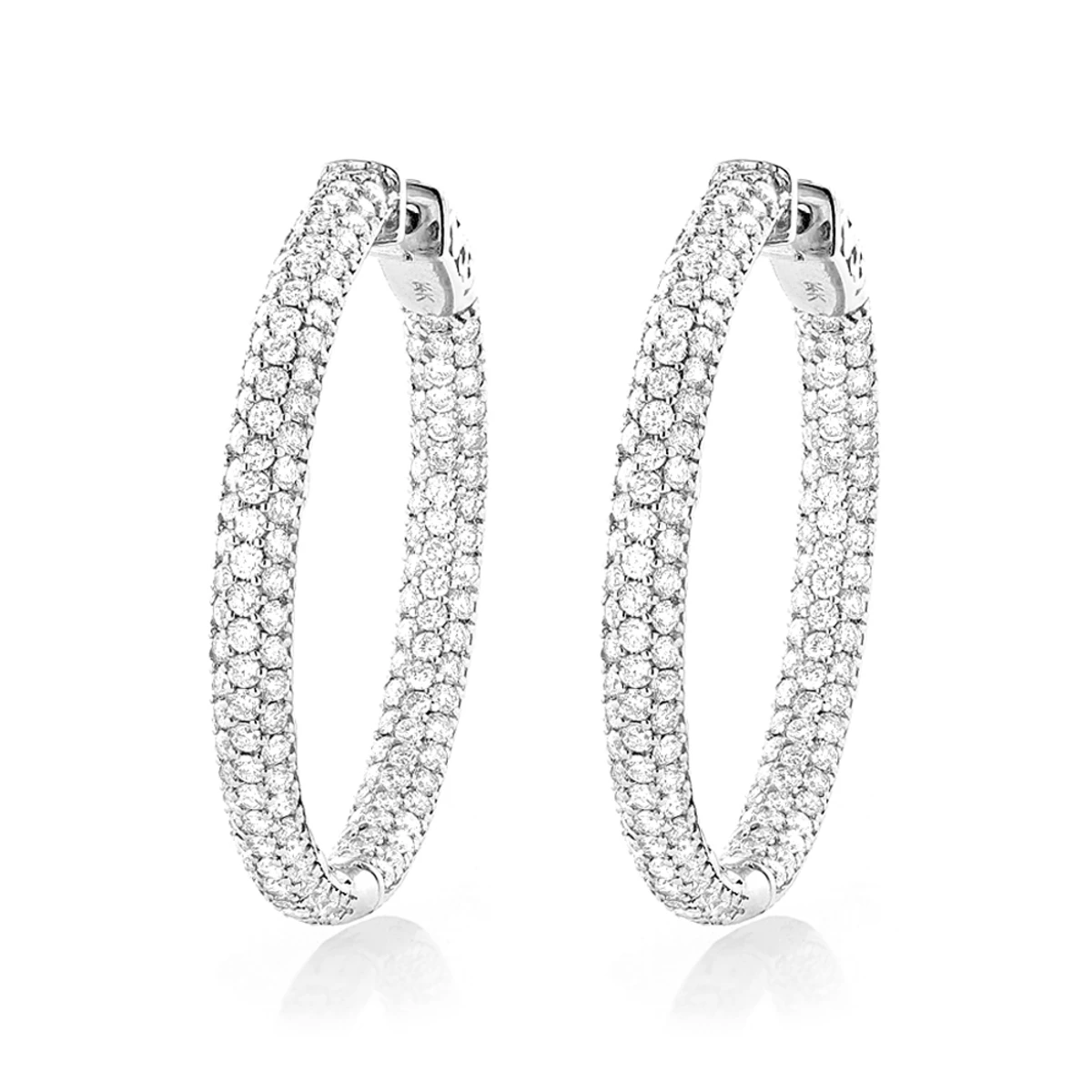 Diamond Hoop Earrings: Feel and look your best wearing these amazing 14K Gold Ladies Inside Out Diamond Hoop Earrings which showcase 5 carats of top quality G/VS pave-set diamonds. These adorable ladies diamond earrings weigh approximately 12 grams and are 1 1/2 inches in diameter. These Ladies Diamond Hoop Earrings will always bring sensational shine no matter where you are.
