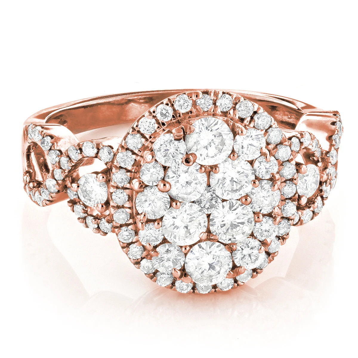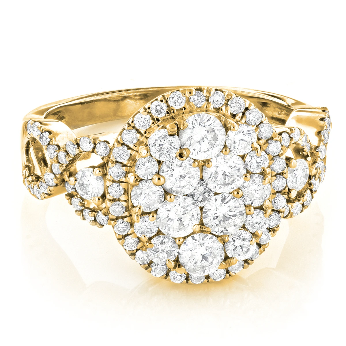 This Large Diamond Cluster Engagement Ring in 14K gold showcases 1.7 carats of dazzling round diamonds. Featuring a fabulous design fit for a queen, this luxurious ladies diamond ring is available in 14K white, yellow and rose gold.