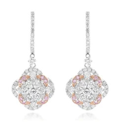 These Designer Flower Cluster Diamond Earrings for Women by Luxurman showcase 2.4 carats of high quality natural white and pink diamonds masterfully set in 14K Gold. These unique ladies diamond earrings with flower gallery on the back can be purchase as a set – matching white and pink diamond pendant and ring are available below.