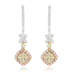 These White Yellow Pink Diamond Drop Earrings by Luxurman showcase 1.4 carats of dazzling high quality diamonds masterfully set in 14K gold base. These ladies diamond cluster earrings with leafs will make a great present for any occasion! Matching white, yellow, pink diamond ring and pendant are available below.