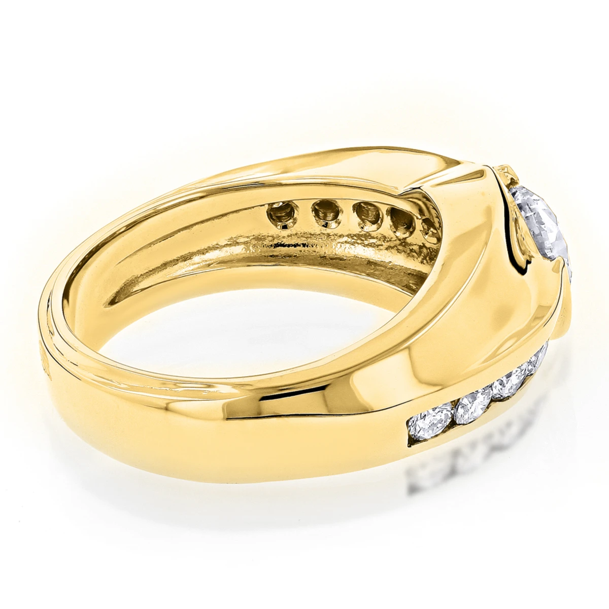 From our diamond engagement rings for men collection this men’s engagement ring features a 1 carat round cut diamond in the center of the ring with 10 round diamonds on the sides (5 on each side of the ring). The ring is made in highly polished 18k gold, all diamonds are G color VS quality.