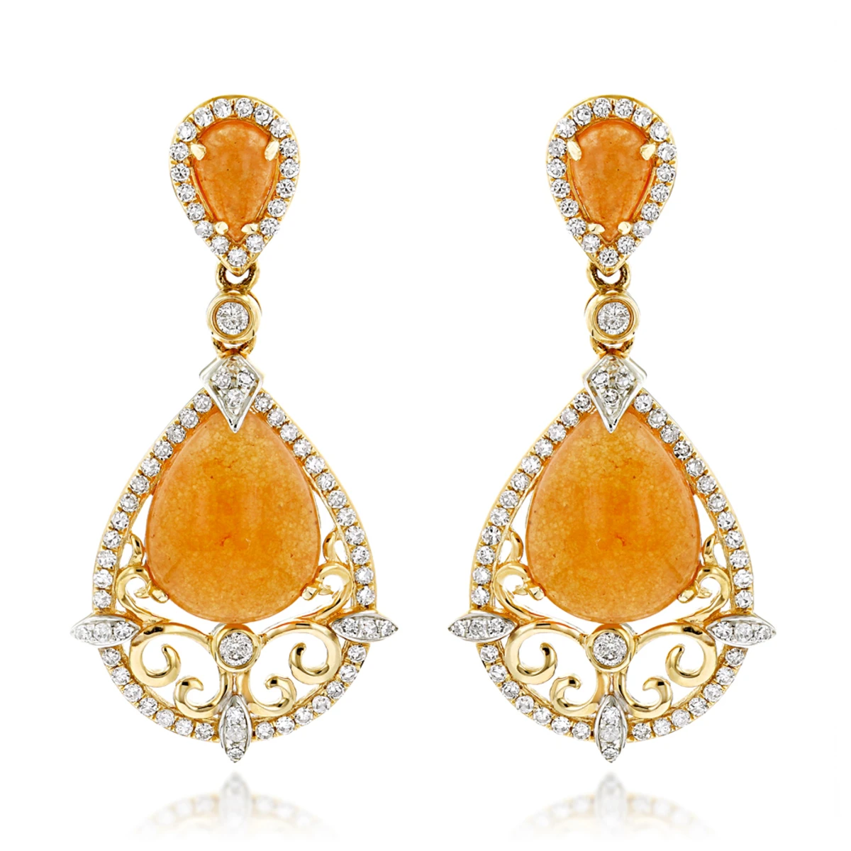 These Orange Aventurine Gemstone Diamond Earrings in 14K gold weigh approximately 7 grams. Showcase 7.56-carats orange aventurine gemstone and 0.7 carats of sparkling round diamonds. Featuring an intricate design and a highly polished gold finish, these ladies diamond earrings are available in 14K white gold, yellow gold and rose gold.