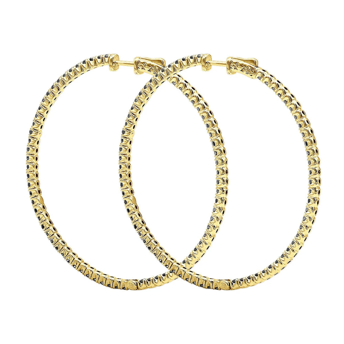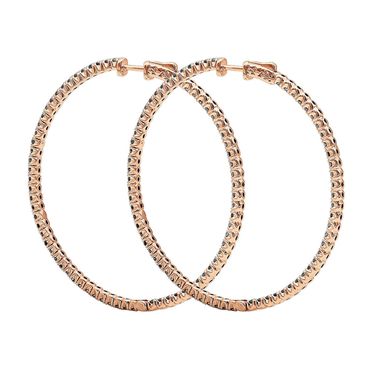 From our diamond earrings for women collection These enchanting 3 Carat Black Diamond 2 Inch Hoop Earrings feature popular Inside Out Design and are manufactured in solid 14k white, yellow and rose gold and are decorated with 3 carats (1.5ct each) of high quality black round diamonds. Without much metal blocking the diamonds shine and beauty, these fantastic black diamond hoop earrings leave a long lasting impression. Being 1/16in. (2mm) wide and just over 2 inches long (58mm), the earrings are featuring an inside out design and look splendid from every angle. These black diamond hoops include a beautiful packaging and make a fabulous gift for any occasion!