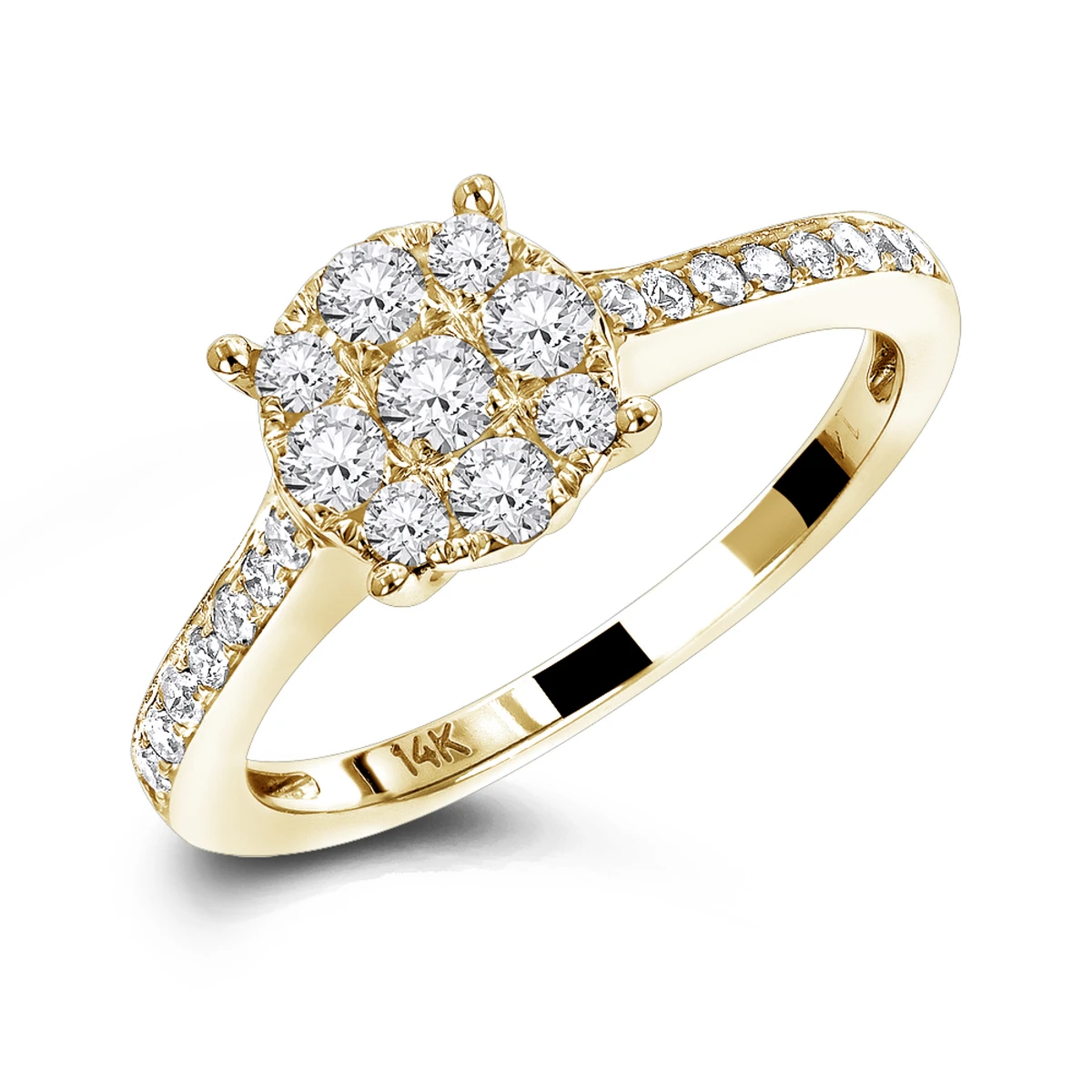 This Round Cluster Diamond Engagement Ring in 14K gold weighs approximately 4 grams and showcases 0.55 carats of sparkling round diamonds. Featuring a lovely design and a highly polished gold finish, this ladies diamond ring is available in 14K white, yellow and rose gold.