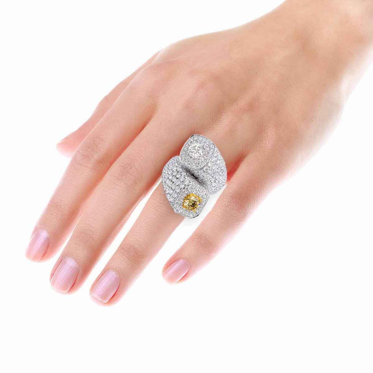This bewitching 18K Gold 13 Carat Unique Diamond Right Hand Ring For Women features a one of a kind intricate design and is simply mesmerising. Right hand rings are status symbols for women all over the world. The band of this stunning right hand ring was meticulously crafted to resemble a fancy swirl and is fully iced out with round pave set white diamonds. The large white and yellow round diamonds at both ends of the dazzling swirl also serve to express your unique individuality. The feminine arrangement of this ring won’t leave anyone indifferent and will be an exclusive addition to any jewelry collection. Bold and flawless, this diamond ring is available in all 18K gold colours (white, rose and yellow) to give you a choice in the important matter of picking a perfect right hand piece.