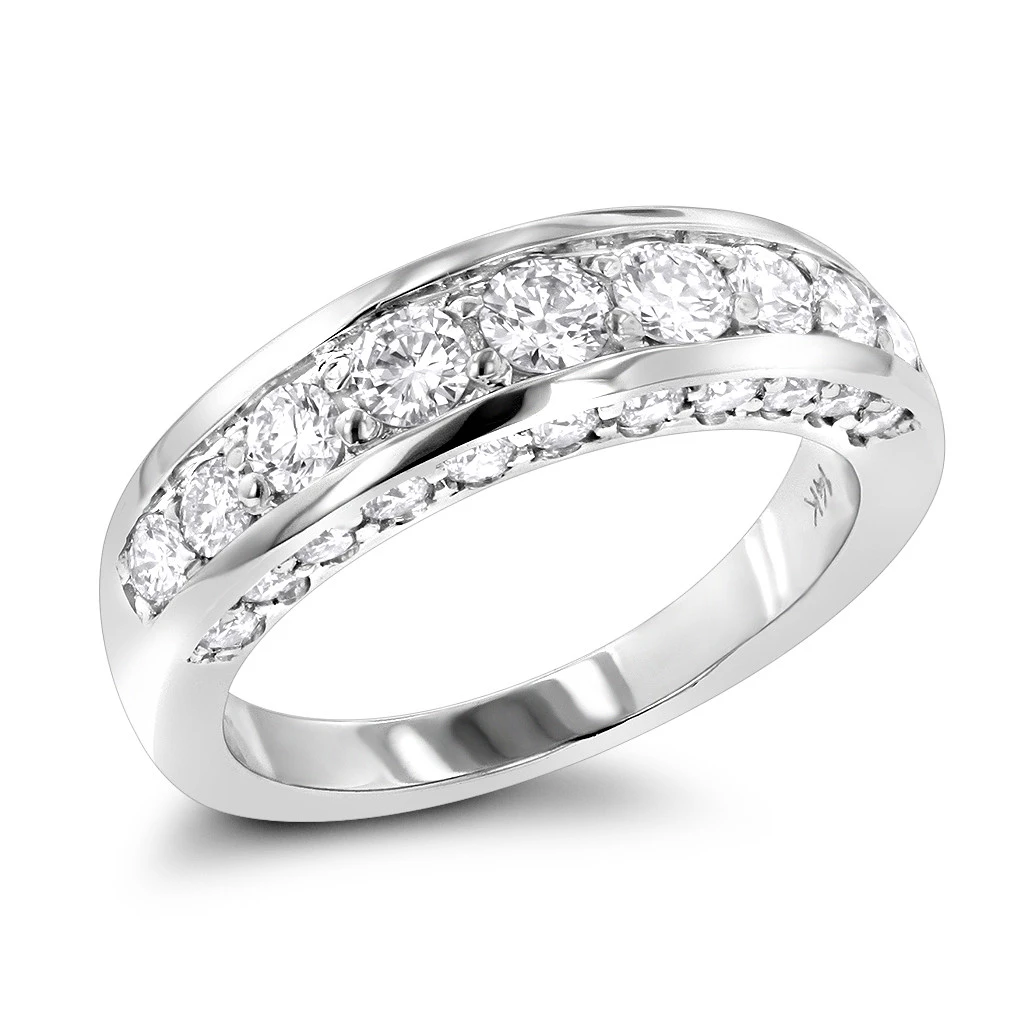 This exquisite 14K Gold Round Diamond Ladies Wedding Ring showcases a total of 1.3 carats of 9 marvelous round diamonds on top and 11 on each side. A true display of love and unity, this diamond wedding band is perfect for that unforgettable special occasion! Available in 14K white, yellow and pink gold.
