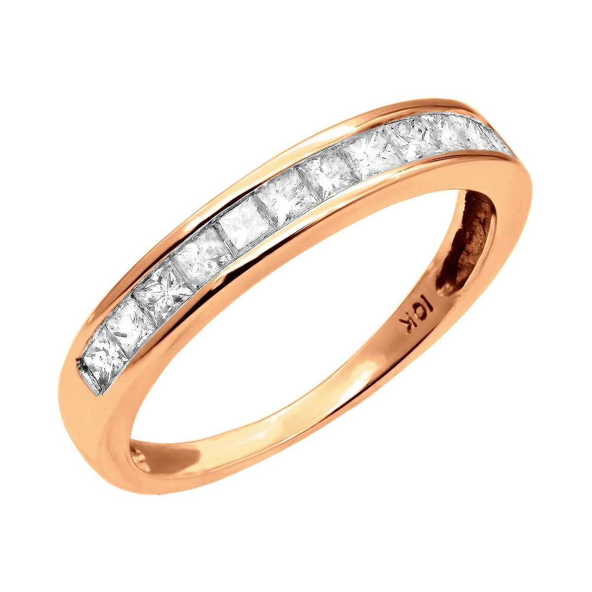 This Ladies Wedding Band with Princess Cut Diamonds weighs approximately 2 grams and showcases 1 carat of channel-set diamonds. Featuring a classic 1 row design and a highly polished gold finish, this ladies diamond ring is available in 10K white, yellow and rose gold.