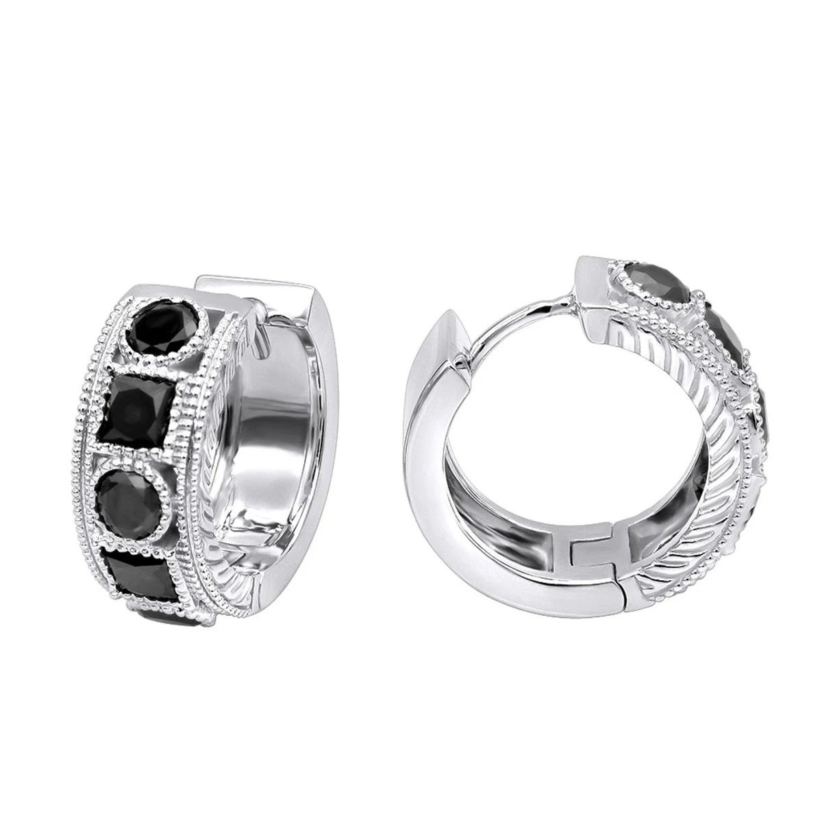 Unique Diamond Hoop Earrings: These Large Black Diamond Huggies in 14k Gold by Luxurman showcase a wide intricate diamond earrings design decorated with 3 carats of black round and princess cut diamonds. Featuring a fabulous design and a highly polished gold finish with bead detailing, these exquisite black diamond earrings are available in 14K white gold, yellow gold and rose gold as well as 18k gold as a custom order.