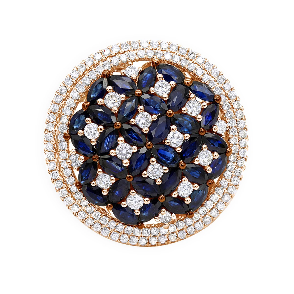 This Royal Halo Diamond and Sapphire Ring for Women by Luxurman showcases vintage yet classy round shape setting design accentuated with miracle combination of 3.5 carats shimmering round diamonds and marquise cut sapphire stones. This diamond right hand ring for women features diamonds and sapphires in the center of the ring playfully set into an ornament that reminds of stars in the sky of Arabian Nights and represents gracefulness and beauty. This ladies ring can be worn as a right hand ring as well as very unique engagement ring. The ring is pretty large at 22mm wide and is available in 14K Yellow, Rose and White gold. This beautiful piece of art will make the best gift ever!