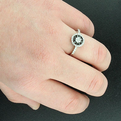 This White Black Diamond Cluster Ring in 14K gold showcases 0.57 carats of genuine diamonds. Featuring a unique black and white design and a highly polished gold finish, this women’s diamond circle ring makes a unique pre-set diamond engagement ring, and is available in 14K white, yellow and rose gold.