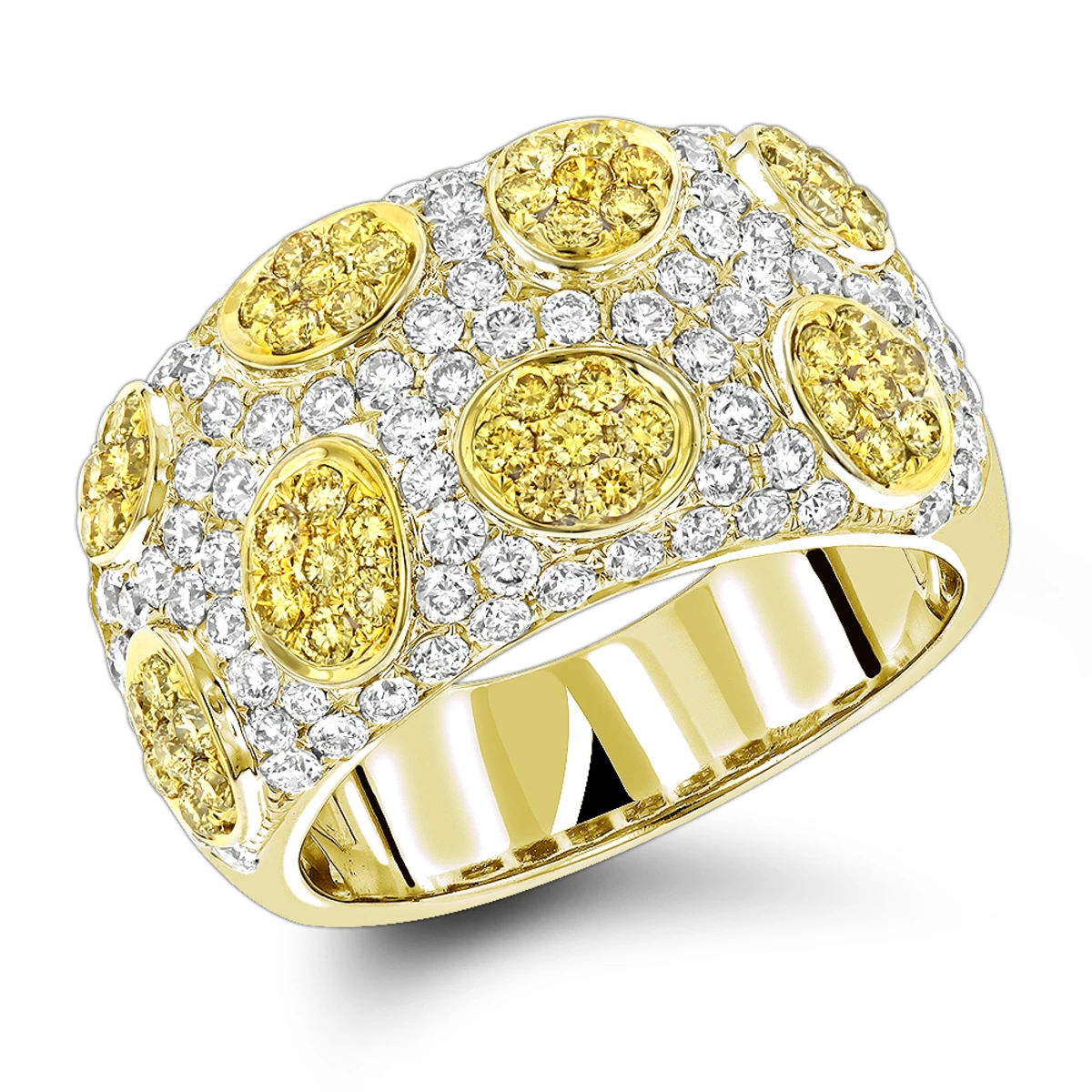 This White and Yellow Diamond Band in 14K gold is a unique ladies ring which weighs approximately 9 grams and showcases 2.38 carats of sparkling round white and yellow diamonds. Featuring a luxurious 2-tone design and a highly polished gold finish, this women’s diamond ring makes a unique diamond wedding band, and is available in 14K white, yellow and rose gold.